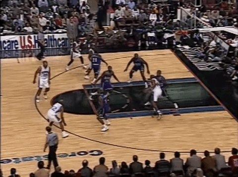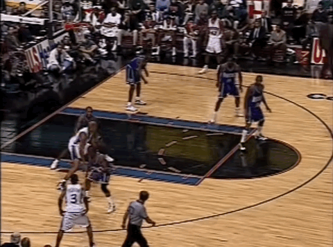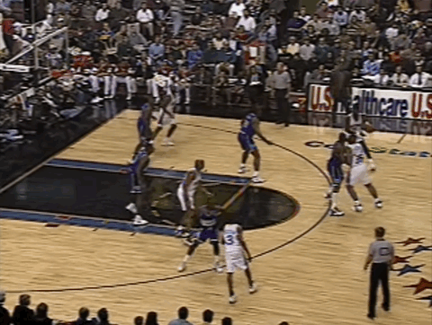 兩幕插曲或許點(diǎn)燃了他的斗志:先是同屆選秀的5號(hào)秀雷-阿倫在他頭上投進(jìn)了生涯首分,“君子雷”在轉(zhuǎn)換中找到了艾弗森,一記突破后的背后運(yùn)球把他晃了個(gè)趔趄,然后穩(wěn)穩(wěn)投進(jìn)了大空位中投;緊接著,杰里-斯塔克豪斯很快還以顏色,他接球后以迅雷之勢(shì)擺脫阿倫,上演了一次十佳球級(jí)別的反身扣籃。