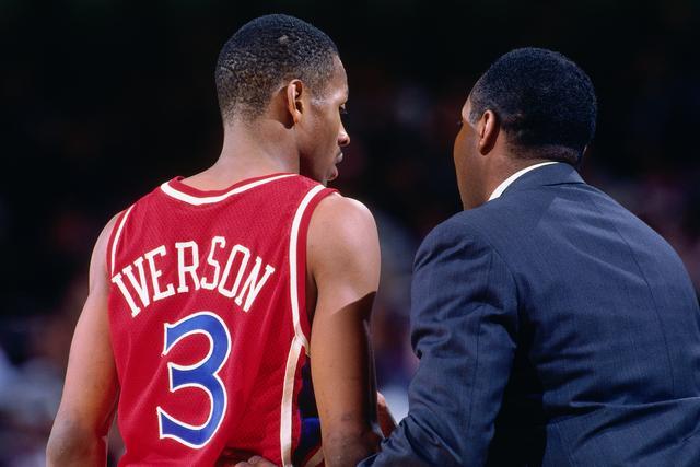 當(dāng)時(shí)聯(lián)盟的進(jìn)攻風(fēng)格與現(xiàn)在天差地別——那仍屬于內(nèi)線的末法時(shí)期,比賽節(jié)奏普遍緩慢而沉悶,進(jìn)攻大多要圍繞大個(gè)子球員展開(kāi)。1990年選秀的狀元秀德里克-科爾曼是76人半場(chǎng)進(jìn)攻的核心,只要他在場(chǎng),球隊(duì)就會(huì)盡量將球交到低位由他發(fā)起。而斯塔克豪斯作為球隊(duì)上個(gè)賽季的頭號(hào)得分手,同樣需要在側(cè)翼和低位獲得進(jìn)攻機(jī)會(huì)。貴為狀元,艾弗森也不得不先學(xué)會(huì)給老大哥們“打下手”,常常需要等待隊(duì)友落位,再伺機(jī)傳球。